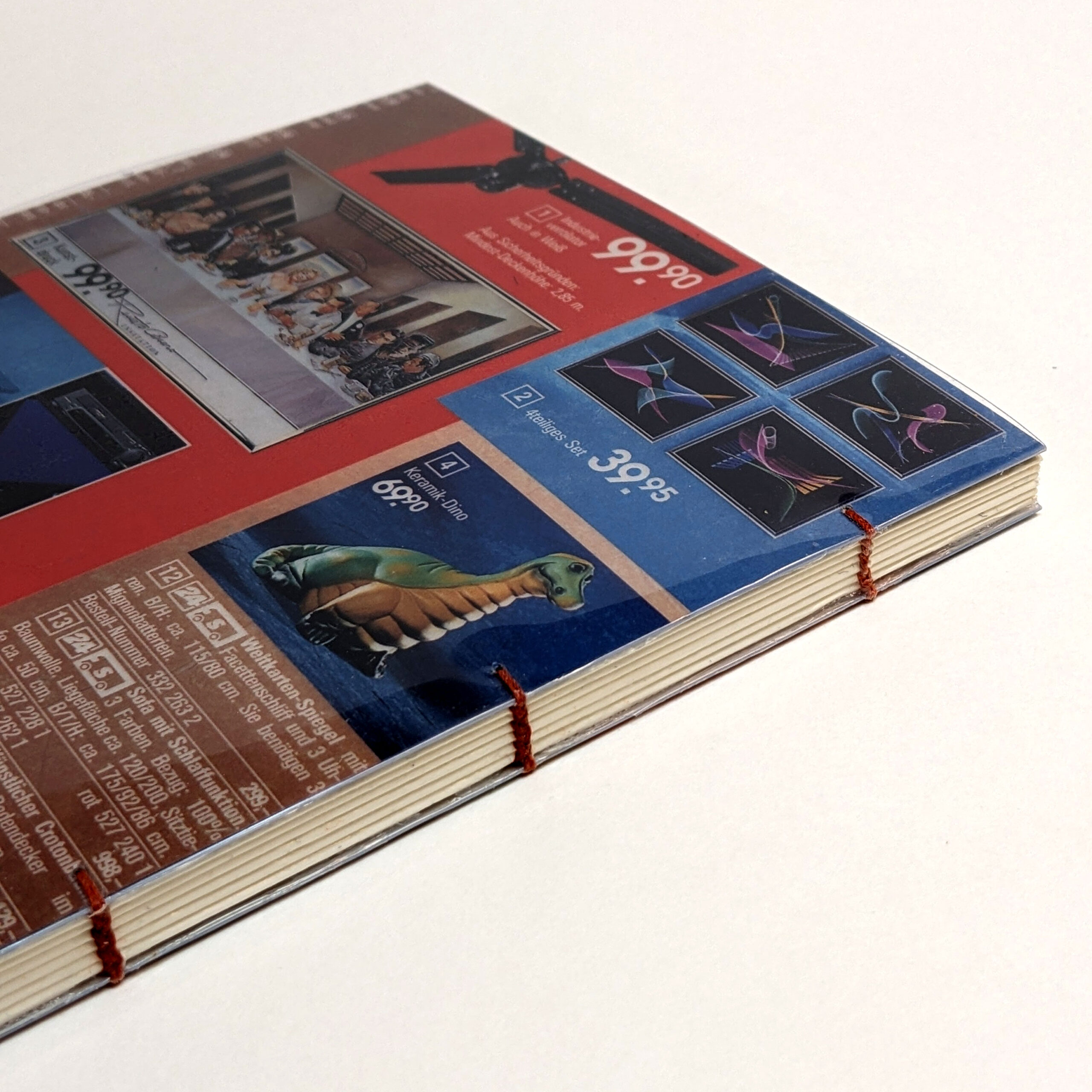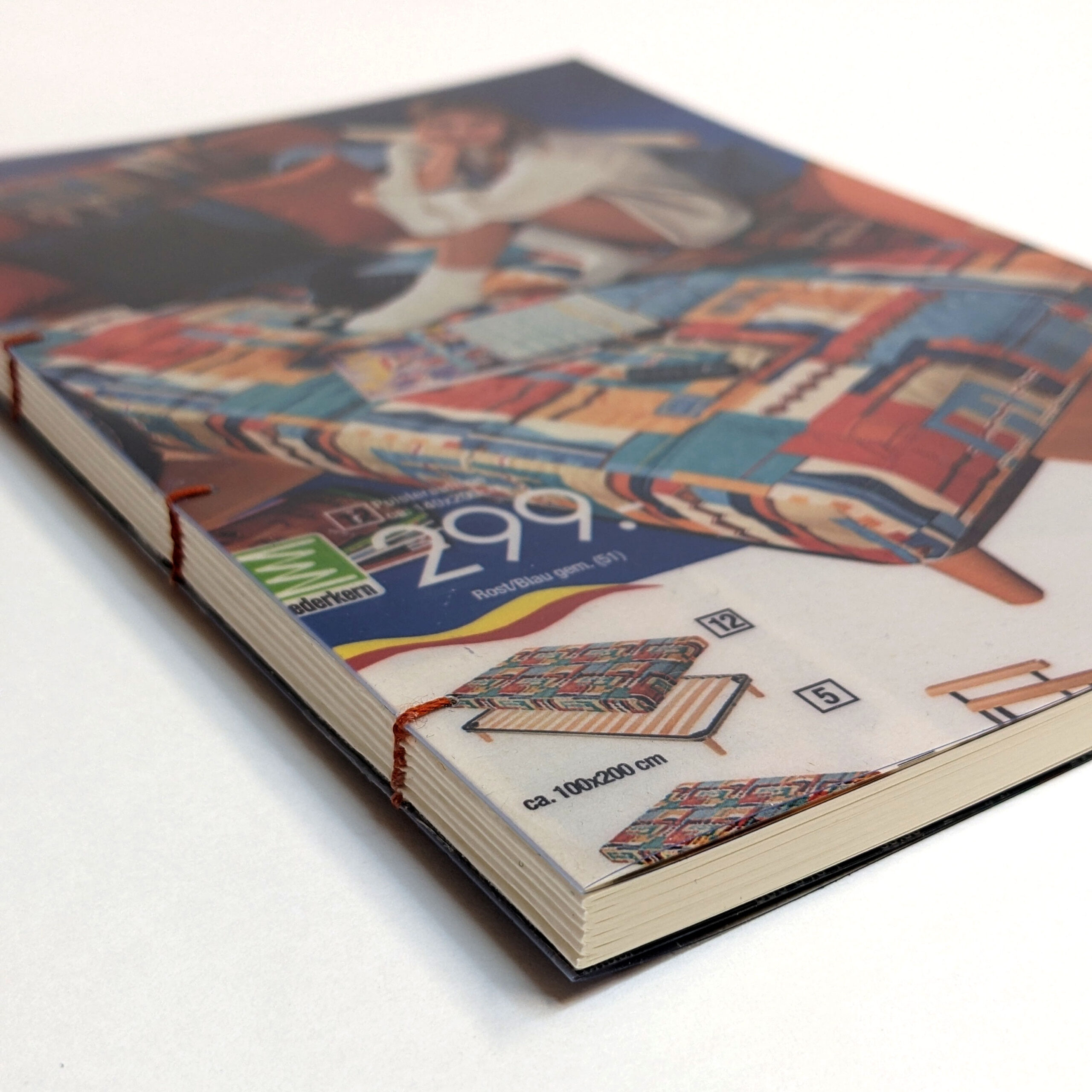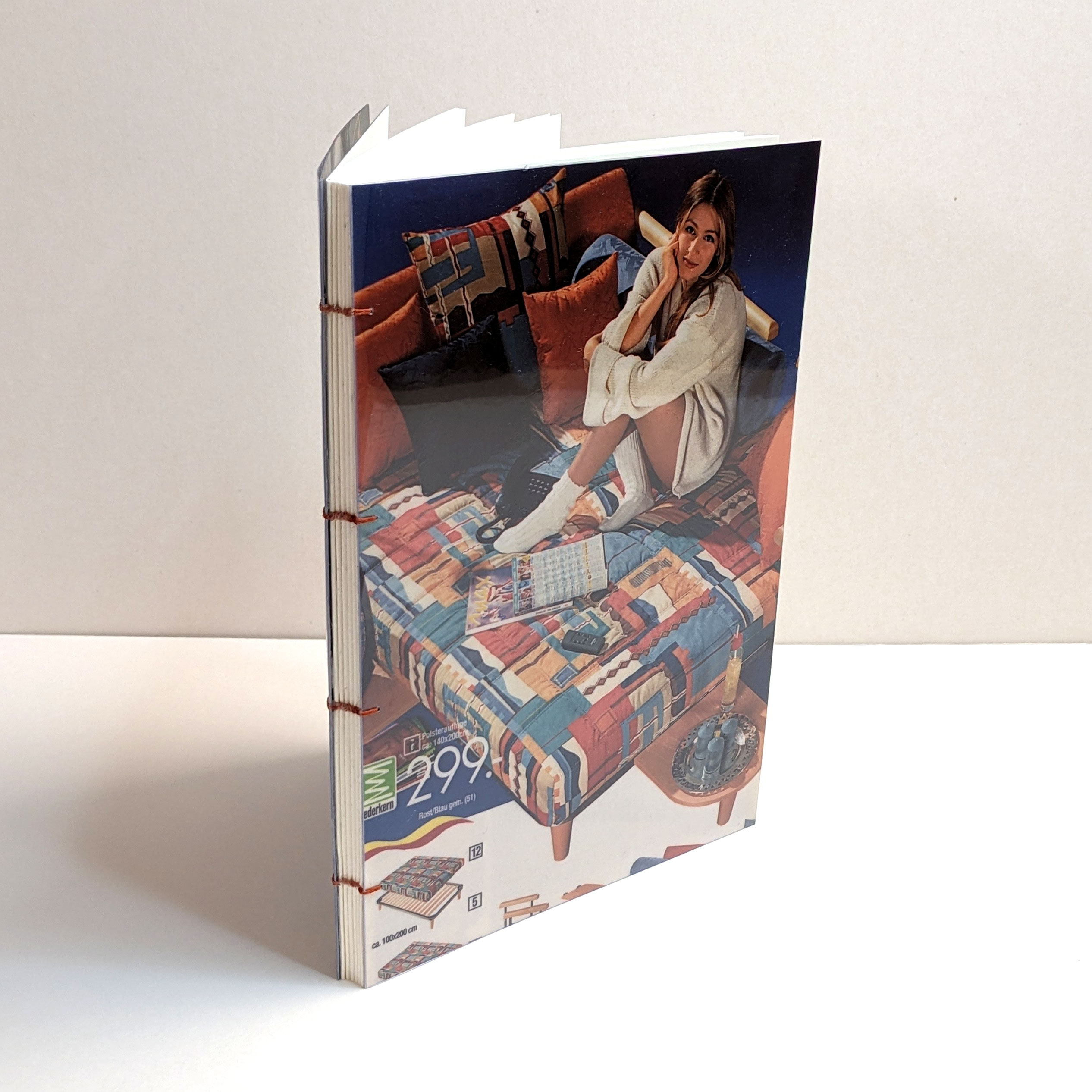 Handmade sketchbook. Every book’s cover is an original cutting form 90’s Otto shopping catalogues from Germany. 90’s aesthetics and style guaranteed! Each notebook is unique. Coptic Stitch Binding Cover: laminated original cut, also covered in transparent plastic for bonus protection and style Size: A5 Paper: Munken Pure 100 g/m2 Inside: blank paper Pages: 80