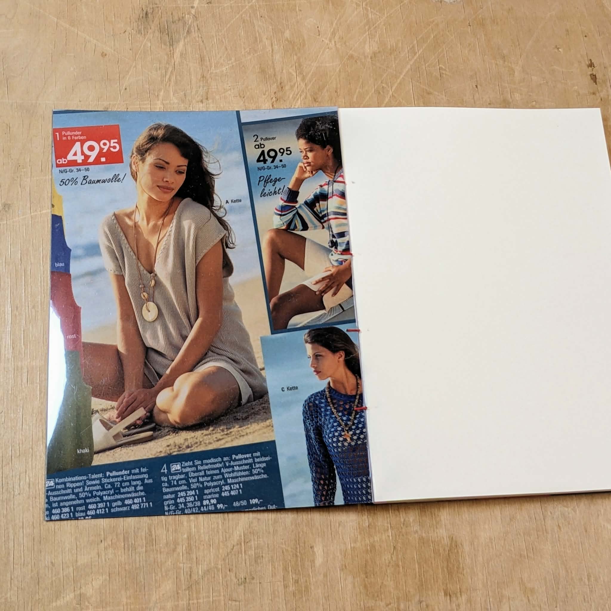 Handmade sketchbook. Every book’s cover is an original cutting form 90’s Otto shopping catalogues from Germany. 90’s aesthetics and style guaranteed! Each notebook is unique. Coptic Stitch Binding Cover: laminated original cut, also covered in transparent plastic for bonus protection and style Size: A5 Paper: Munken Pure 100 g/m2 Inside: blank paper Pages: 80